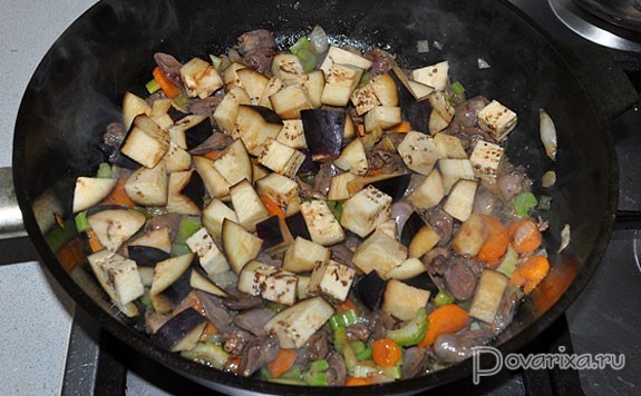 Кладем сердечки. Все так же перемешивая и переворачивая, жарим сердечки с овощами 5-6 минут, пока они светлеют.