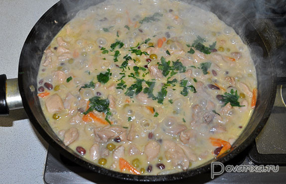 Посыпаем зеленью и оставляем готовое блюдо под крышкой несколько минут дойти.