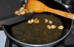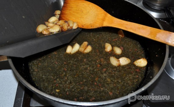 А в сковороду добавляем сливочное масло и, немного снизив сильный огонь, подрумяниваем дольки чеснока.