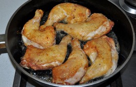 Немного масла (в курице хватает жира) 4-5 минут перекаливаем на самом сильном огне в толстодонной сковороде. Жарим окорочка примерно по 4 минуты сторону, до ярких корочек. Перекладываем в форму для запекания.