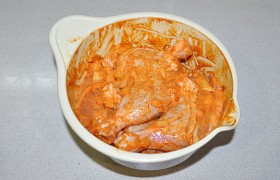 Закладываем окорочка, руками перемешиваем, втираем маринад. Оставляем мариноваться на полчаса-час на столе. В холодильнике окорочка могут мариноваться до суток.