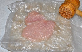 Каждый кусок помещаем в пищевой пакет и легко (мясо очень нежное) отбиваем с одной стороны деревянным молотком. Так равняем толщину всех кусков филе.