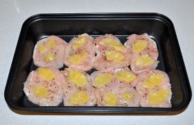 Форму промазываем маслом, все куски филе приправляем перцем и солью, раскладываем в форме.