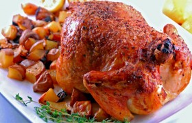 - Такую курицу можно приготовить вместе с гарниром. Нарезать картофель, перемешать его с маслом, солью и перцем, разложить вокруг курицы. А мелкий молодой картофель можно запечь целиком, с кожицей.