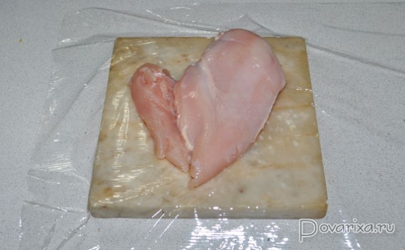 Эту сторону и отбиваем, толстую часть, стараясь выровнять толщину филе. Молоток – деревянный, удары – легкие и частые.