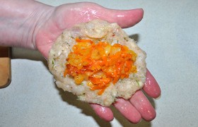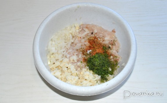 Размороженную рыбу нарезаем кусочками, отжимаем от лишней влаги, мелко рубим в мясорубке или в чаше блендера. В фарш добавляем хлеб (слегка отжатый), лук, укроп, приправы, вымешиваем до однородности и 20-22 раза отбиваем – после чего в фарш вовсе не нужны яйца.