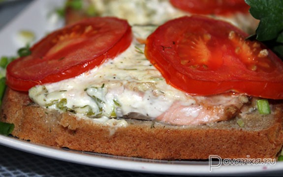 Куски филе размещаем на хлебе. Есть любимые травы вроде Итальянских - посыпаем.