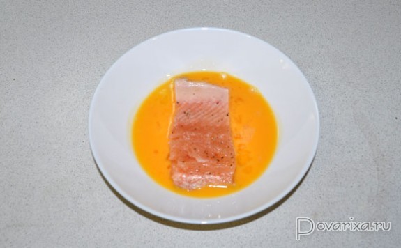 Делим филе на 4-5 кусков. Обе стороны приправляем, посыпав перцем и солью. Окунаем кусочки в яйцо, взбитое слегка вилкой, или смазываем кистью.