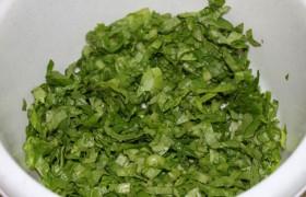 Листья салата ромэн перебираем, промываем и обсушиваем. Собрав в пучок, рубим листья поперек и большим ножом – вдоль. Получаем маленькие прямоугольники.