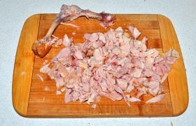 С копченого куриного окорочка снимаем кожу, мясо отделяем от костей и нарезаем мелкими кусочками.
