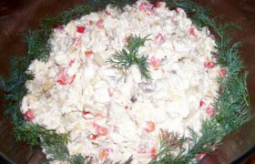- Соединяем все ингредиенты. Слегка солим и смешиваем с майонезом. 2-3 четвертинки яиц можно положить сверху для украшения и полить майонезом.
