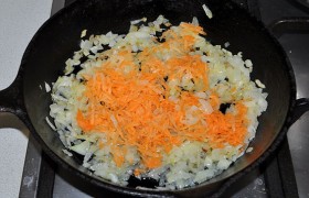 Натираем крупно морковь и добавляем к луку, обжариваем еще 3-4 минуты.